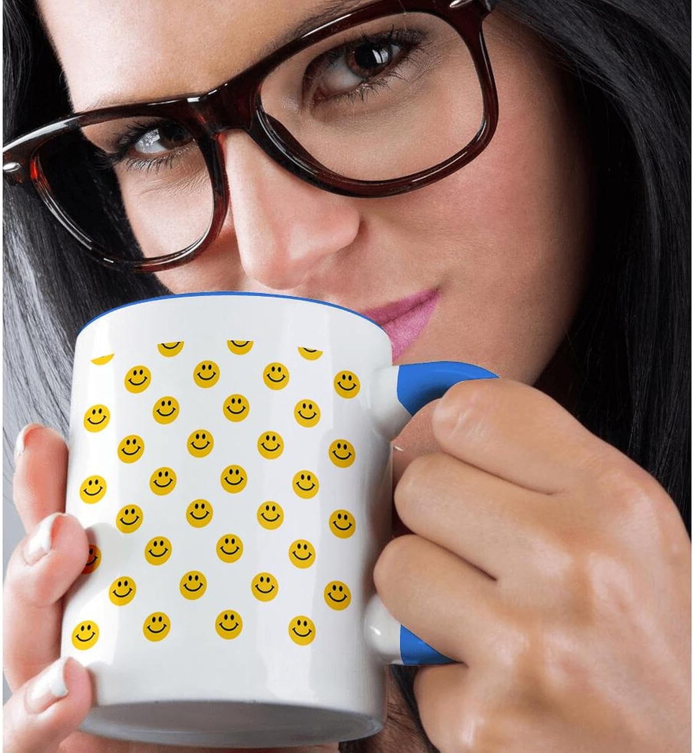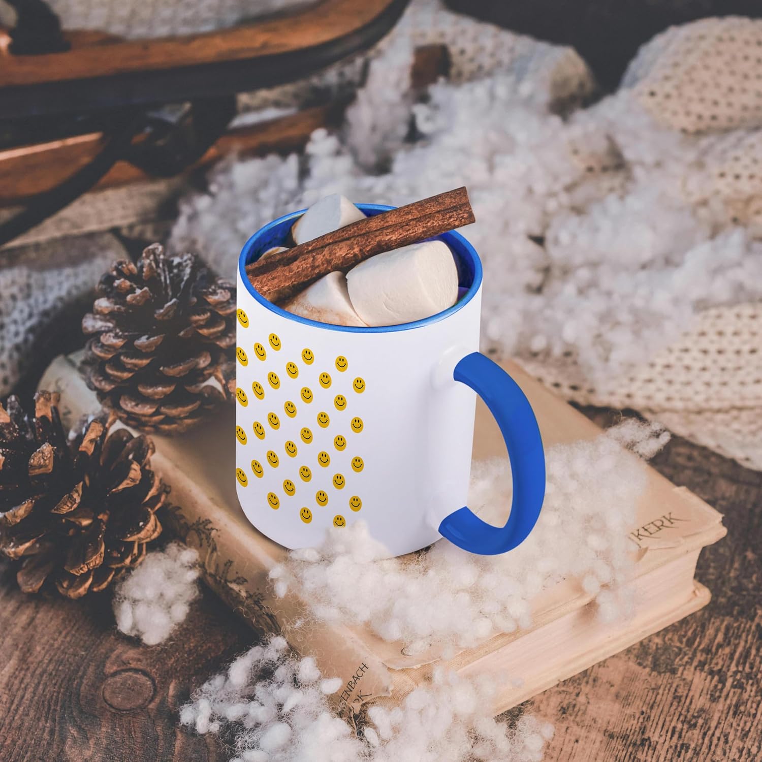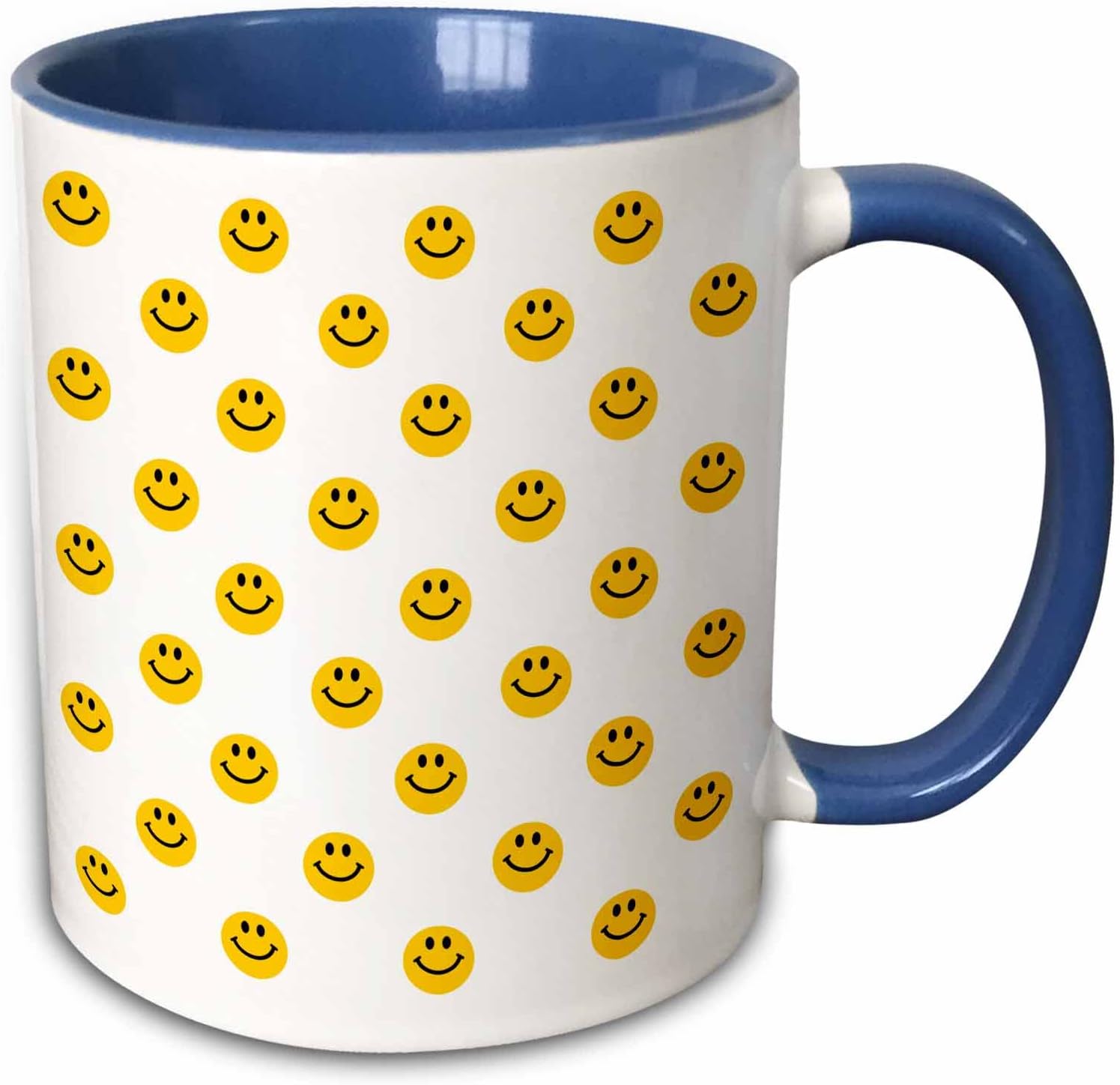 3dRose mug_76655_6 “Yellow Smiley Face pattern – Cute Traditional Happy Smilies – 1960s Hippie style smiling smileys” Two Tone Blue Mug, 11 oz, Multicolor
