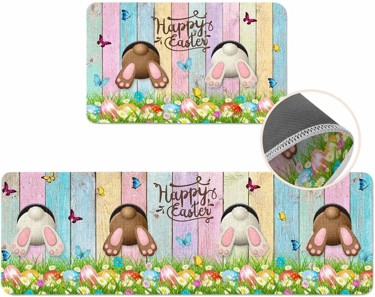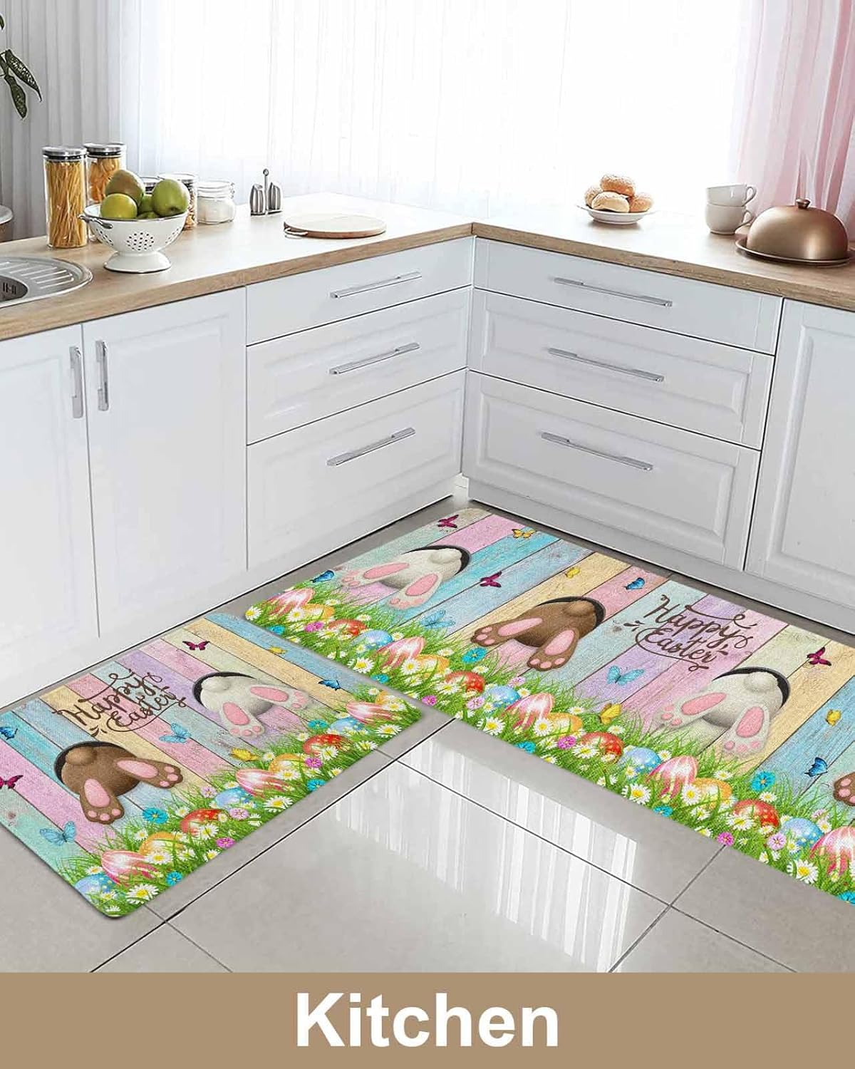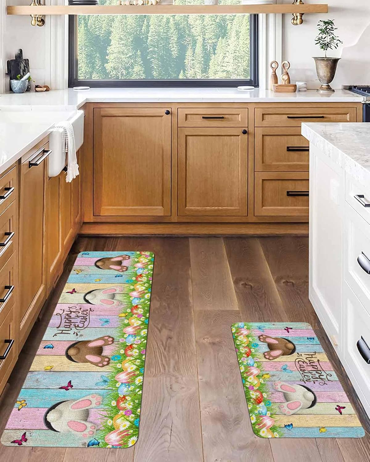 Artwork Store 2PCS Easter Eggs Kitchen Floor Mats, Watercolor Bunny Paw Non-Slip Kitchen Rugs Sets Blue Pink Teal Woodgrain Soft Cotton Linen Doormat for Hallway, Laundry Room, 16×24 Inch+16×47 Inch