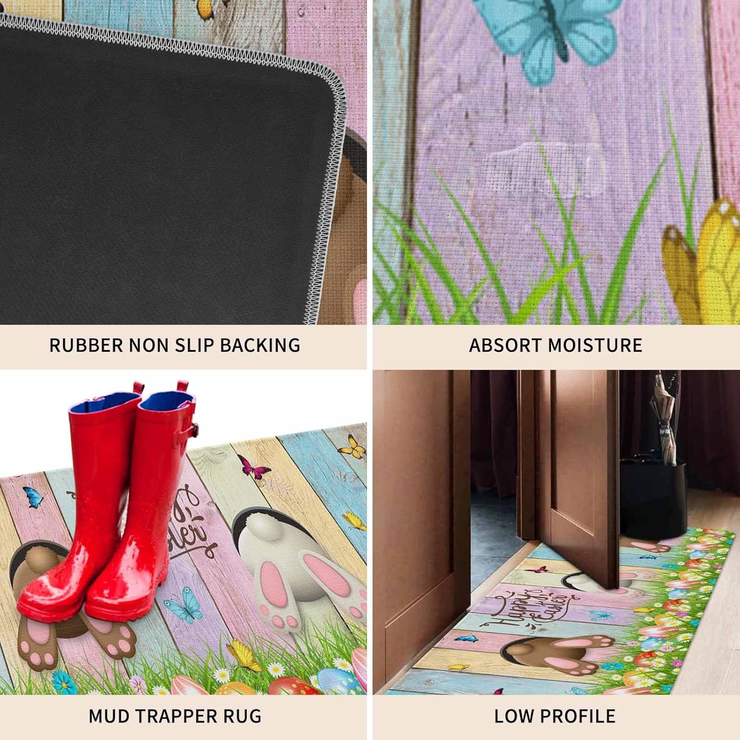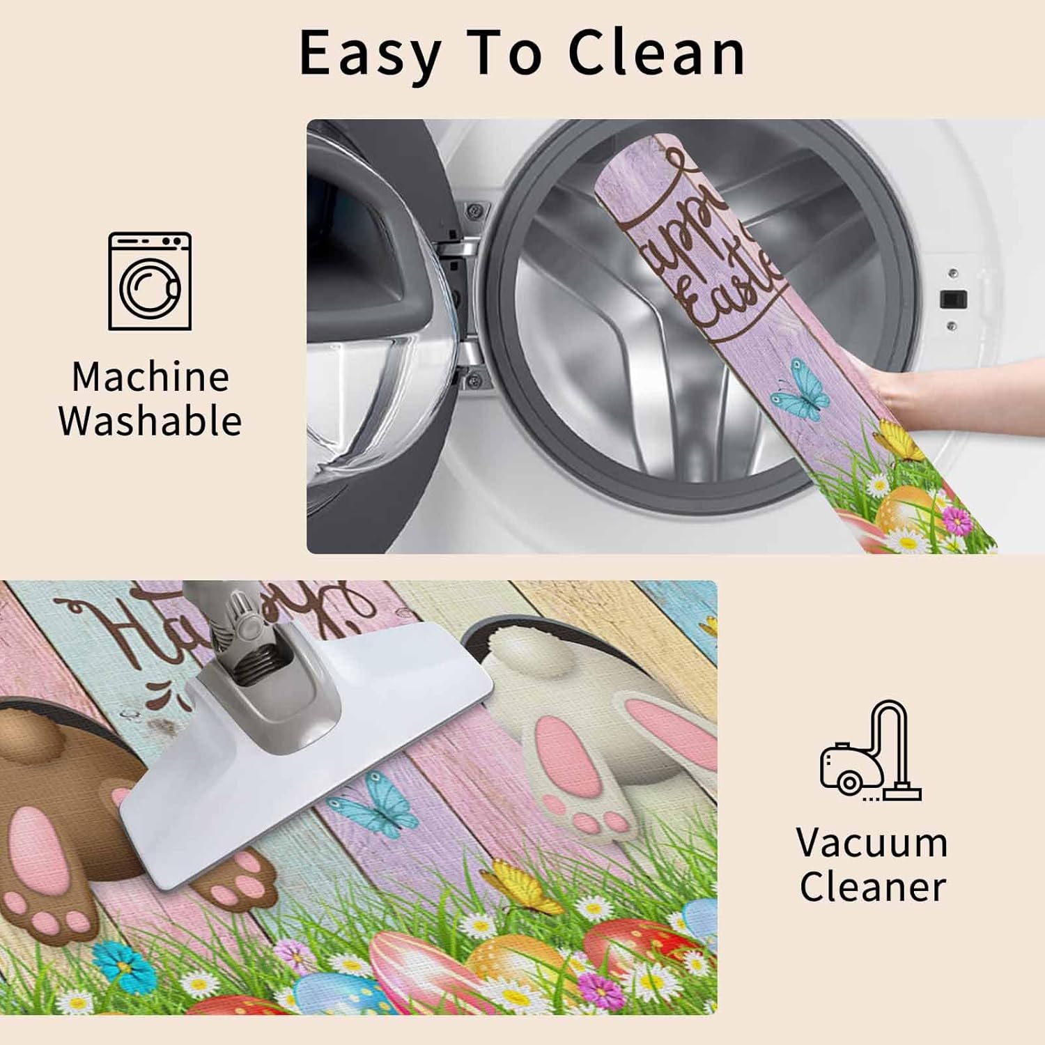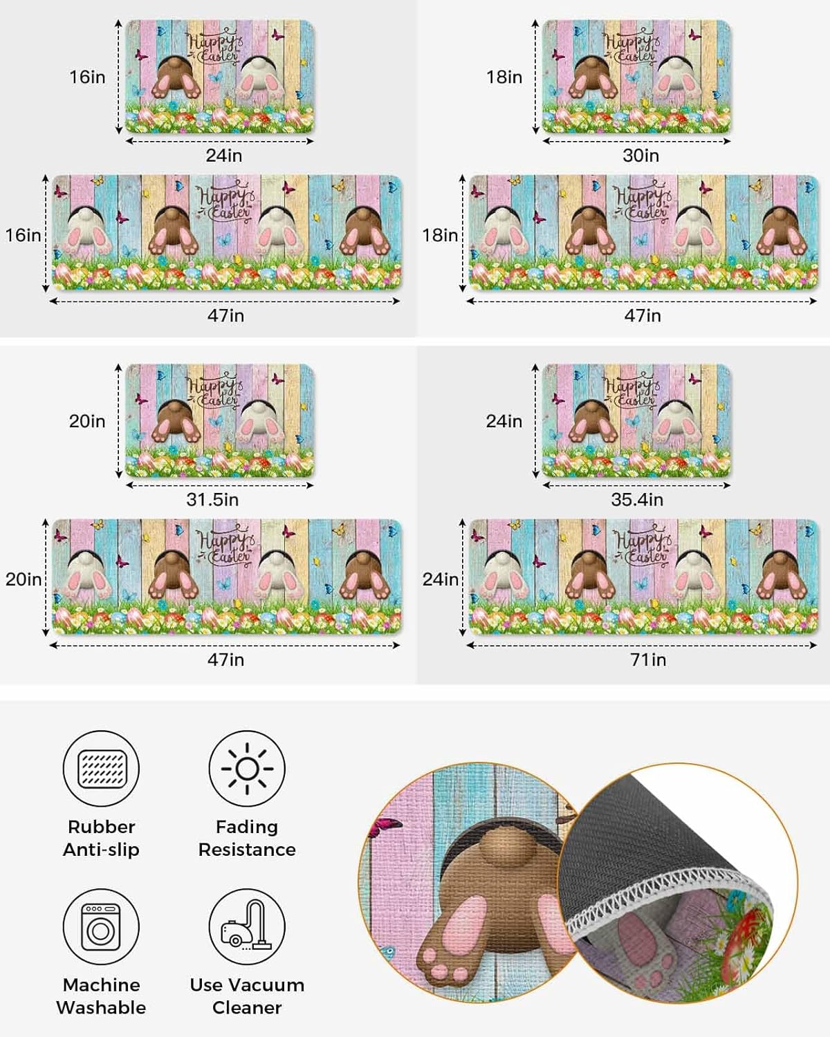 Long-standing on the hard floor will often cause back pain or pain in the feet. These anti fatigue Easter Eggs kitchen mats will provide comfort and help relieve pressure on your feet whether you??re cooking, preparing food, or working at your standing desk, and adds increase a sense of comfort to your daily life. It’s special charming Easter bunny pattern design and Watercolor Wood Grain in modern style enhance the beauty of your home decoration. Easter Day Bunny Kitchen rugs with non skid backing provides safety for your family. The kitchen mats can be used on multiple surfaces, such as wood, ceramic, marble, etc. Suitable for use in the kitchen, living room, laundry room, or office. Make sure the floor is clean and dry before use. Washable Bunny paw kitchen floor carpet set provides ample support for standing in kitchen, kitchen sink, stove, laundry room, office, farmhouse or any other high-traffic indoor or outdoor space. Make your kitchen more stylish and comfortable with these durable, unique, seasonal Easter Colorful Wood grain kitchen mats. Add a pop of color in the entryway and protect your floors too. Perfect for any kitchen, deck, patio, porch, veranda and entryway, let your floor look more Easter atmosphere. The color matches any Easter decor. Also be great gift idea for Thanksgiving, Christmas or any other holiday!