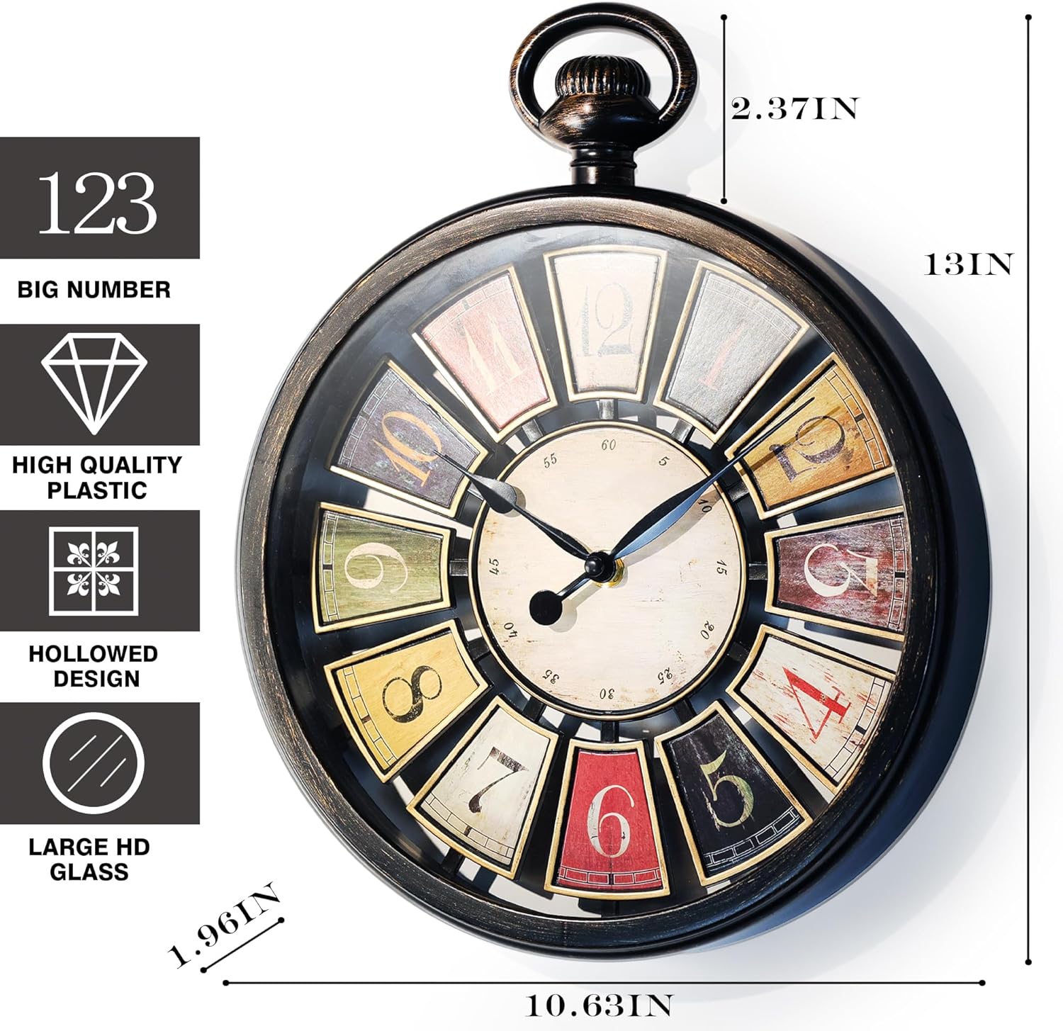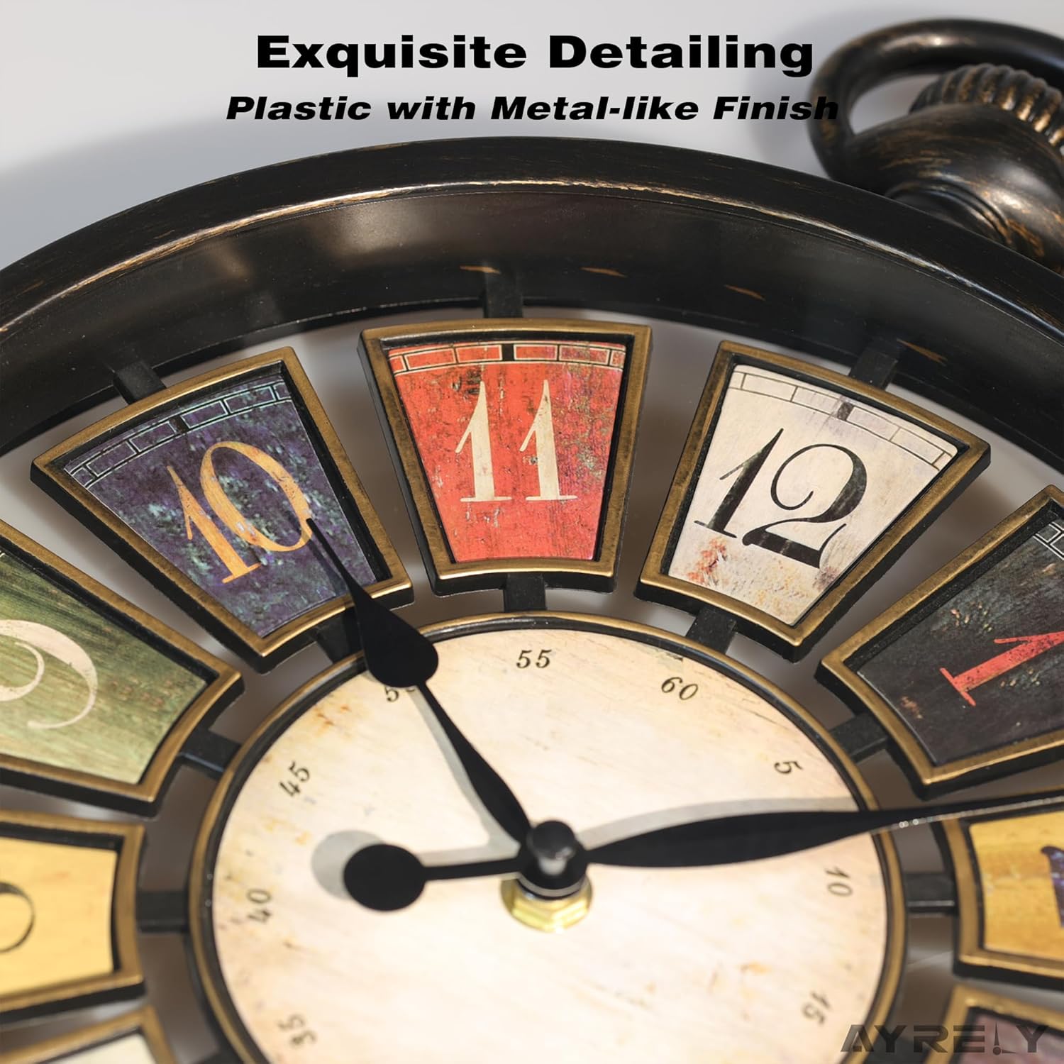 AYRELY 2024 Retro Vintage Wall Clock – a stunning addition to any room in your home! Measuring 13 inches in height and 10.63 inches in width, this clock features a vintage-style top loop design reminiscent of the oldest pocket watch designs. The standout feature of this clock is its central hollowed-out design, highlighting its farmhouse style, hand-painted to create an authentic, textured look. One of the best features of this clock is its advanced, silent movement mechanism, ensuring accurate timekeeping without any distracting ticking sounds. This mechanism requires only one AA battery to operate, making it an energy-efficient and cost-effective choice for your home. Despite its luxurious appearance, this clock is primarily made from durable plastic materials, making it lightweight and easy to securely hang on any wall. From a distance, it’s nearly impossible to tell that it’s not made of metal, thanks to our factory’s skilled use of metal-imitation techniques in the frame’s design. The clock hands are made of sturdy yet lightweight aluminum, perfectly complementing the vintage aesthetic. Whether you’re looking to add a touch of vintage charm to your living room or bedroom, this Retro Vintage Wall Clock is the perfect choice. Order yours today and enjoy the sophisticated style and reliable performance that this clock brings to your home!