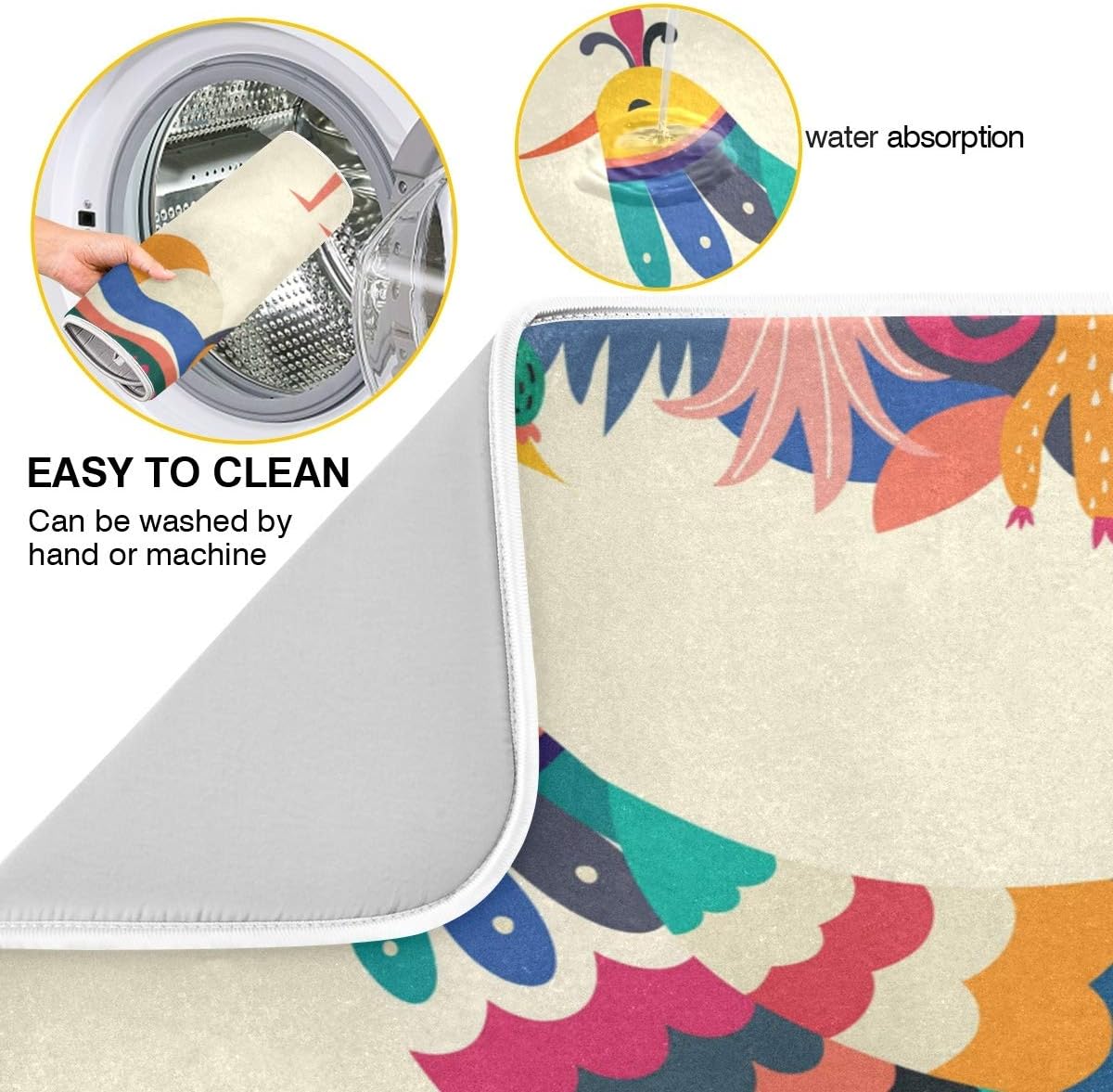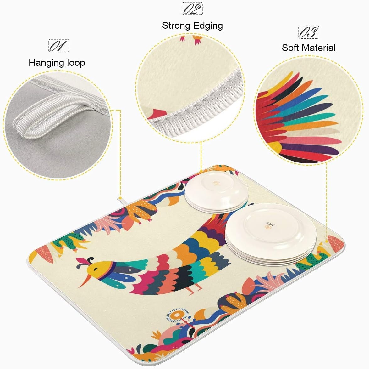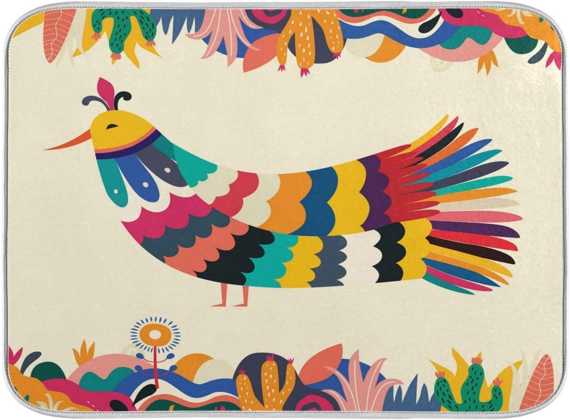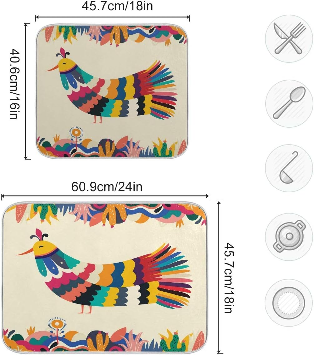 Colorful Mexican Design Stylish Artistic Bird Dish Drying Mat for Kitchen, Absorbent Microfiber Drying Pad Dish Mat, 24″ X 18″
