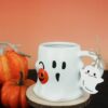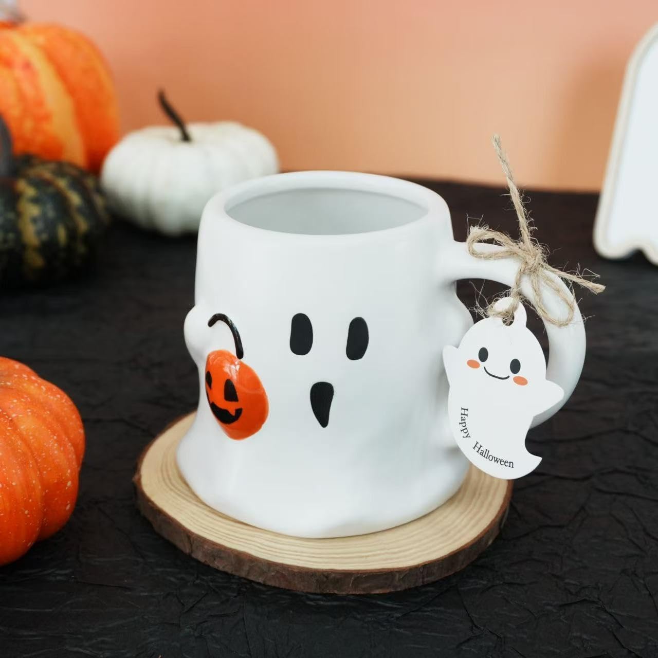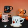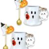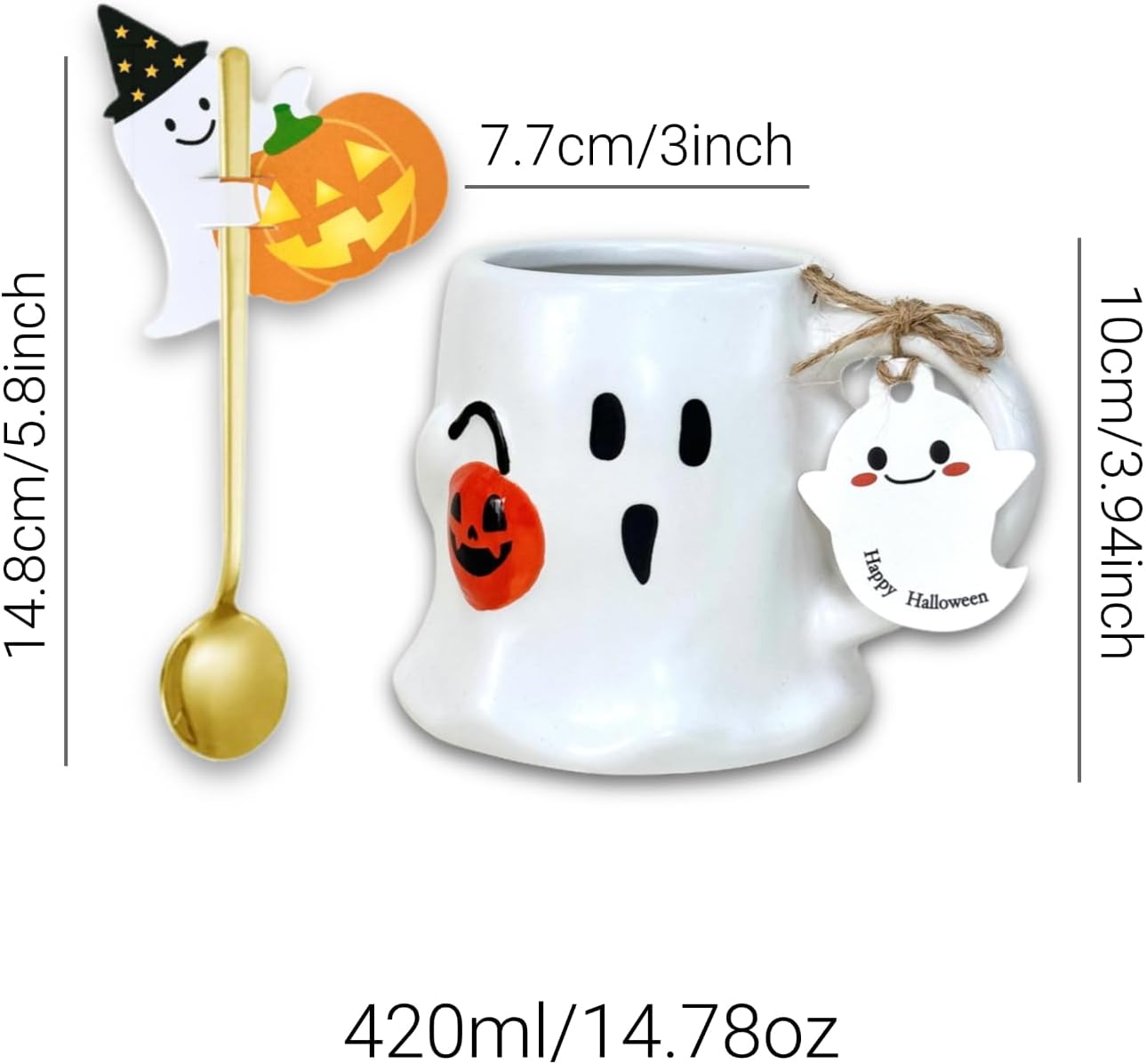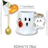 Domini 14.78 oz Halloween Ghost face Pumpkin Coffee Mug(set of 2)- Cute Ceramic Cup with spoons,Includes tags, cards,Halloween Accessories Birthday Gifts for Kids Adult (white)