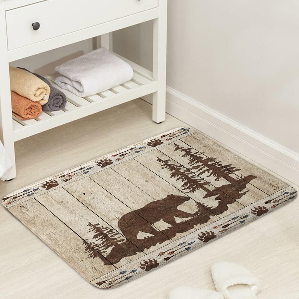 DYNH Bear Bath Mats Rugs for Bathroom, Wild Animals Rustic Cabin Forest Flannel Bathroom Floor Mat Bath Shower Rug Non Slip, Bear Print Wooden Board Doormat Mat Bathroom Accessories Decor 17x29inch