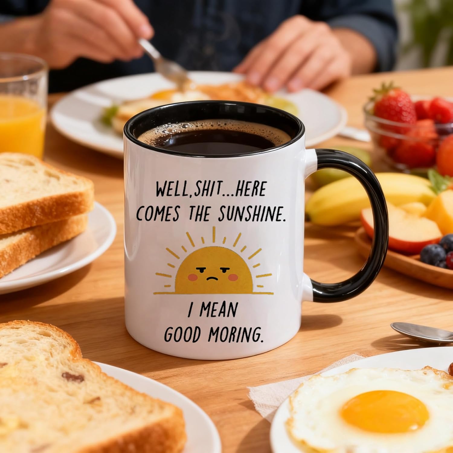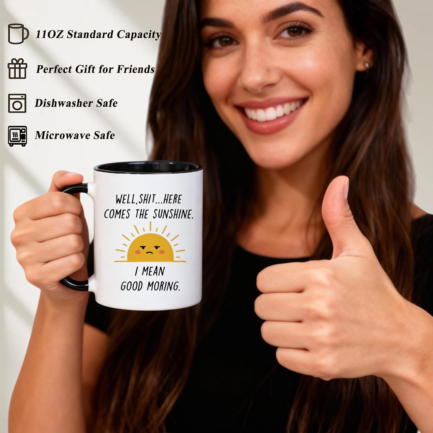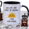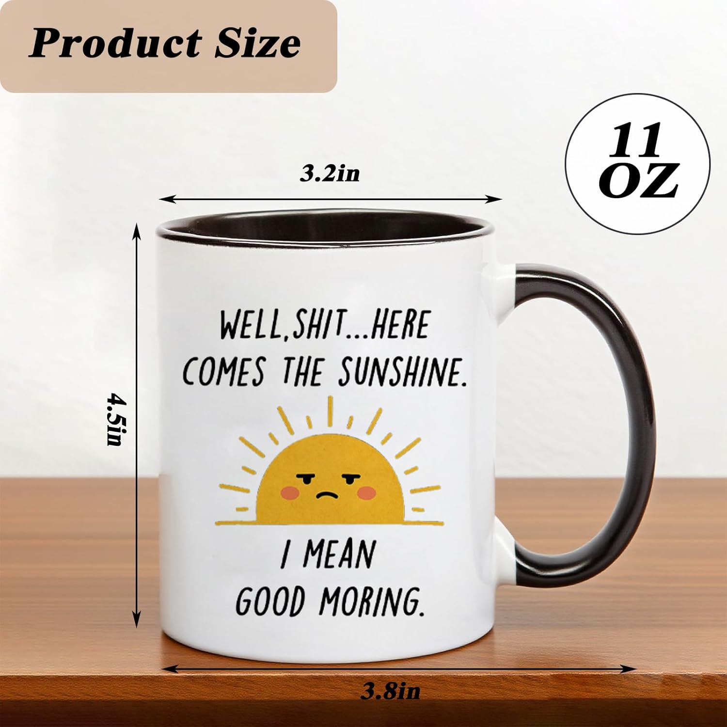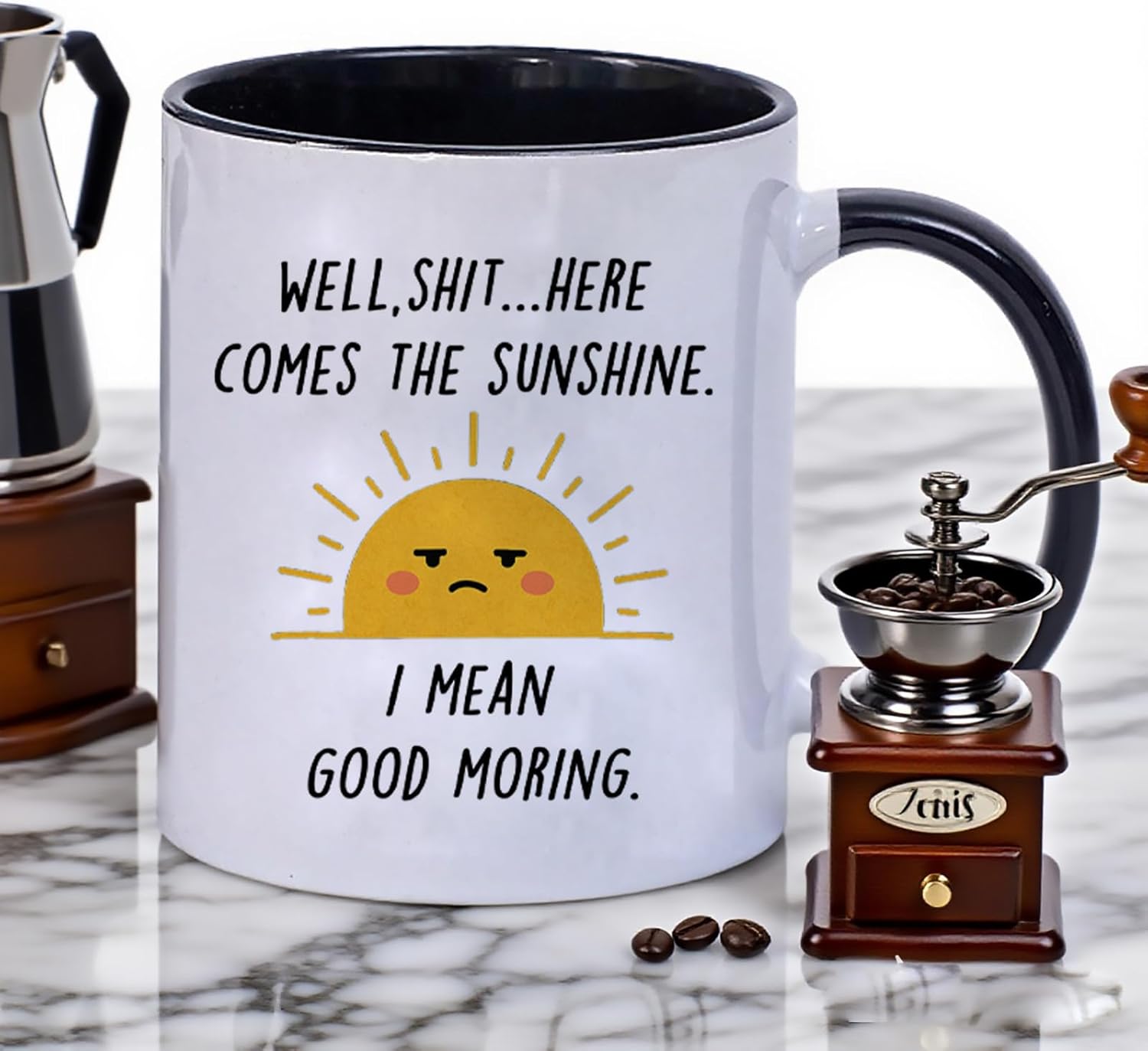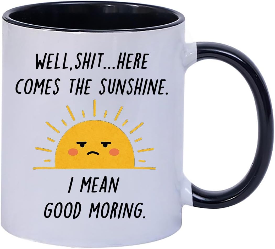 Funny Coffee Mug with Sarcastic Sunshine Quote – “Well, Shit…Here Comes The Sunshine. I Mean Good Morning.” – 11 oz White & Black Accent Ceramic Cup – Gift for Women, Friends & Co-workers