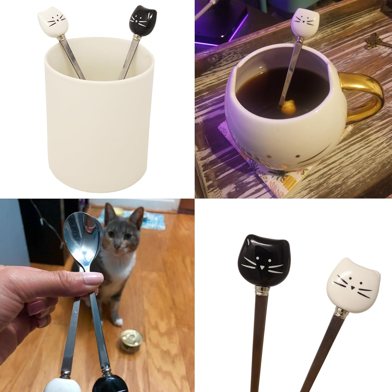 Honbay 2PCS Cute Cat Spoon Set – Stainless Steel Tea, Coffee & Sugar Spoons for Cat Mug, Black and White