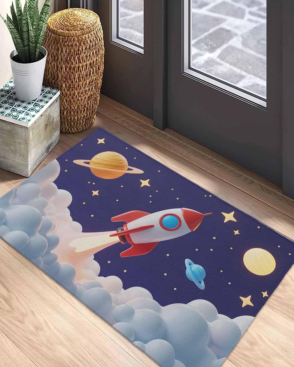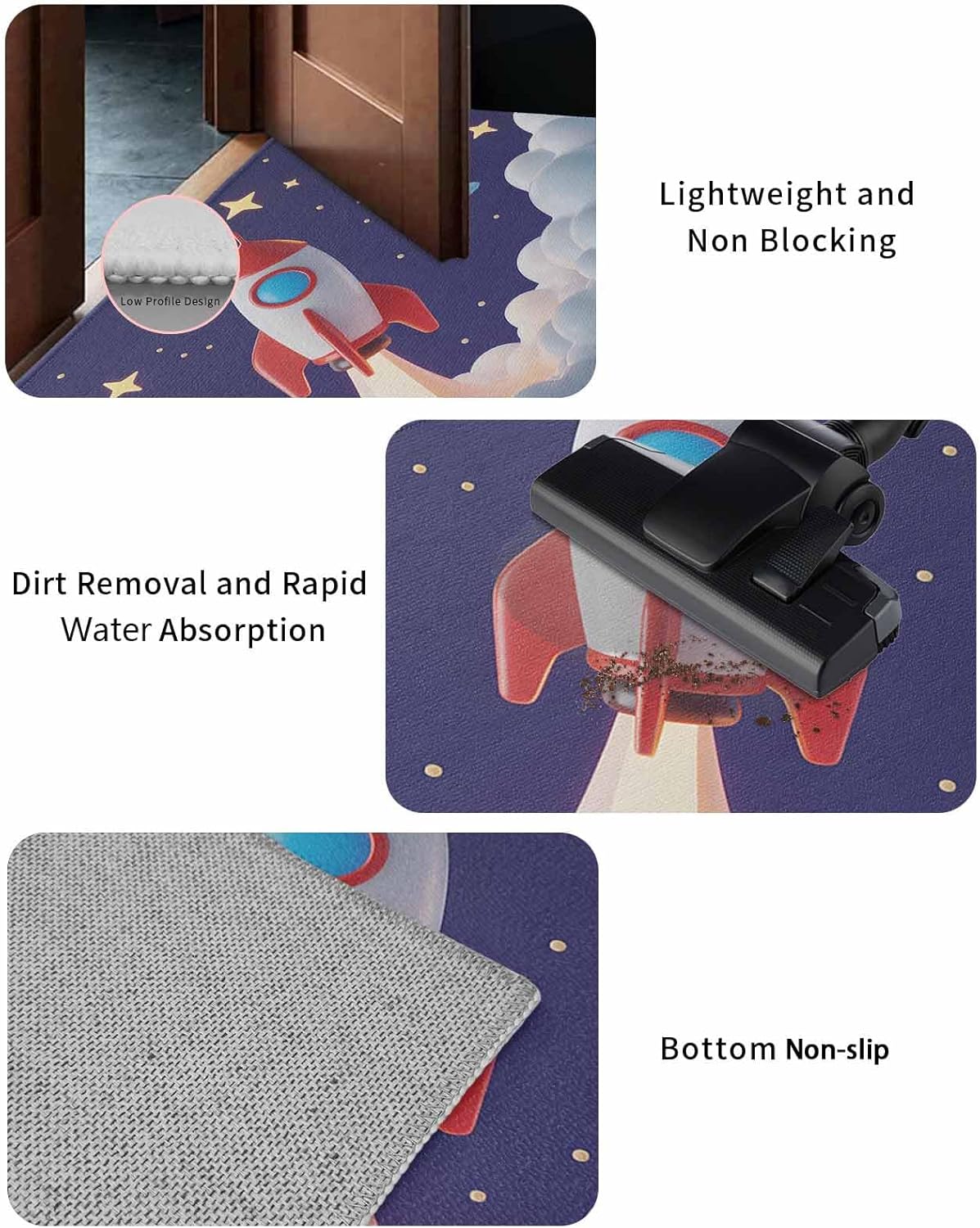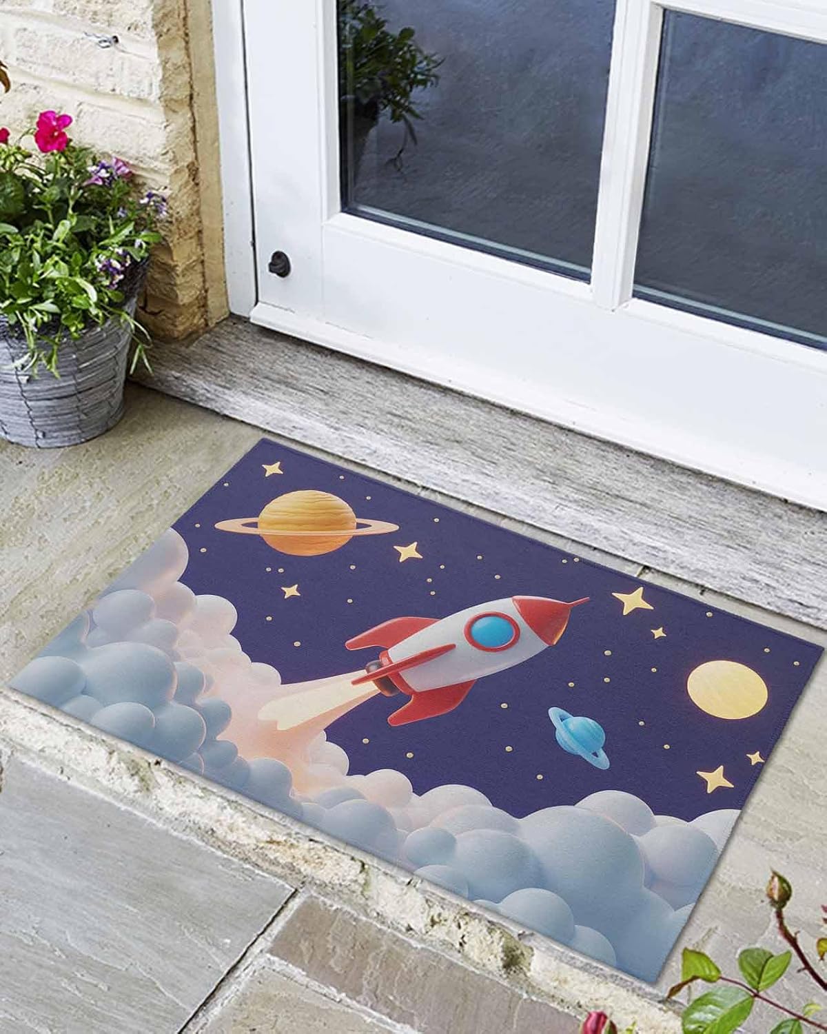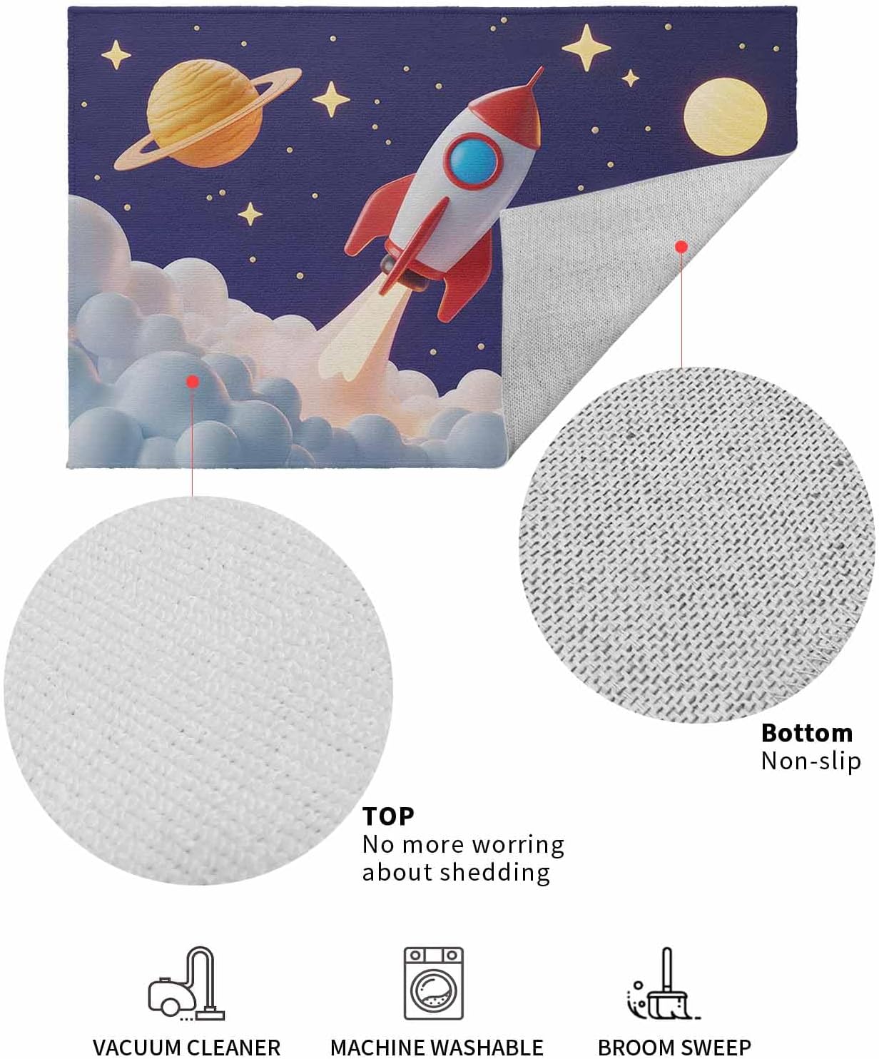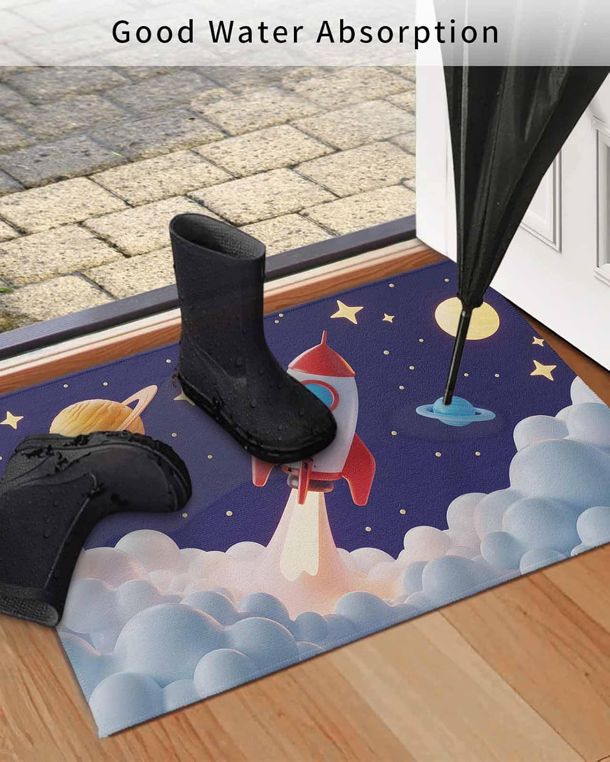 Indoor Door Mat, Rocket Space Universe Planet Absorbent Entrance Mat Doormat Low Profile Floor Mats for Front Back Door Entryway 16x24in Night Star Cartoon Style