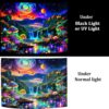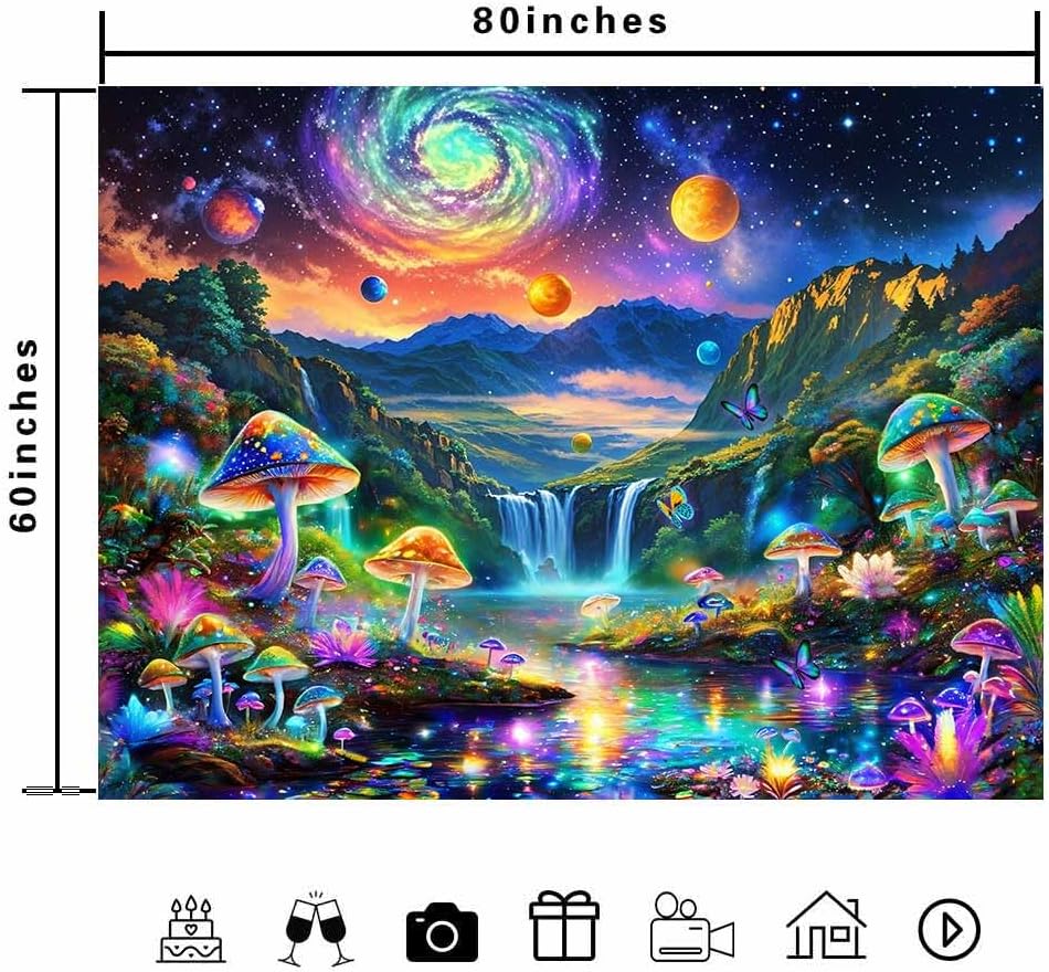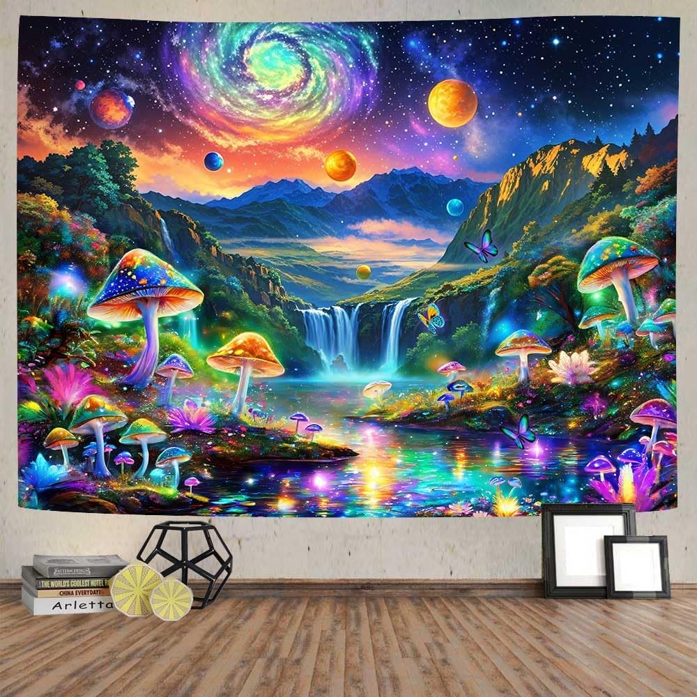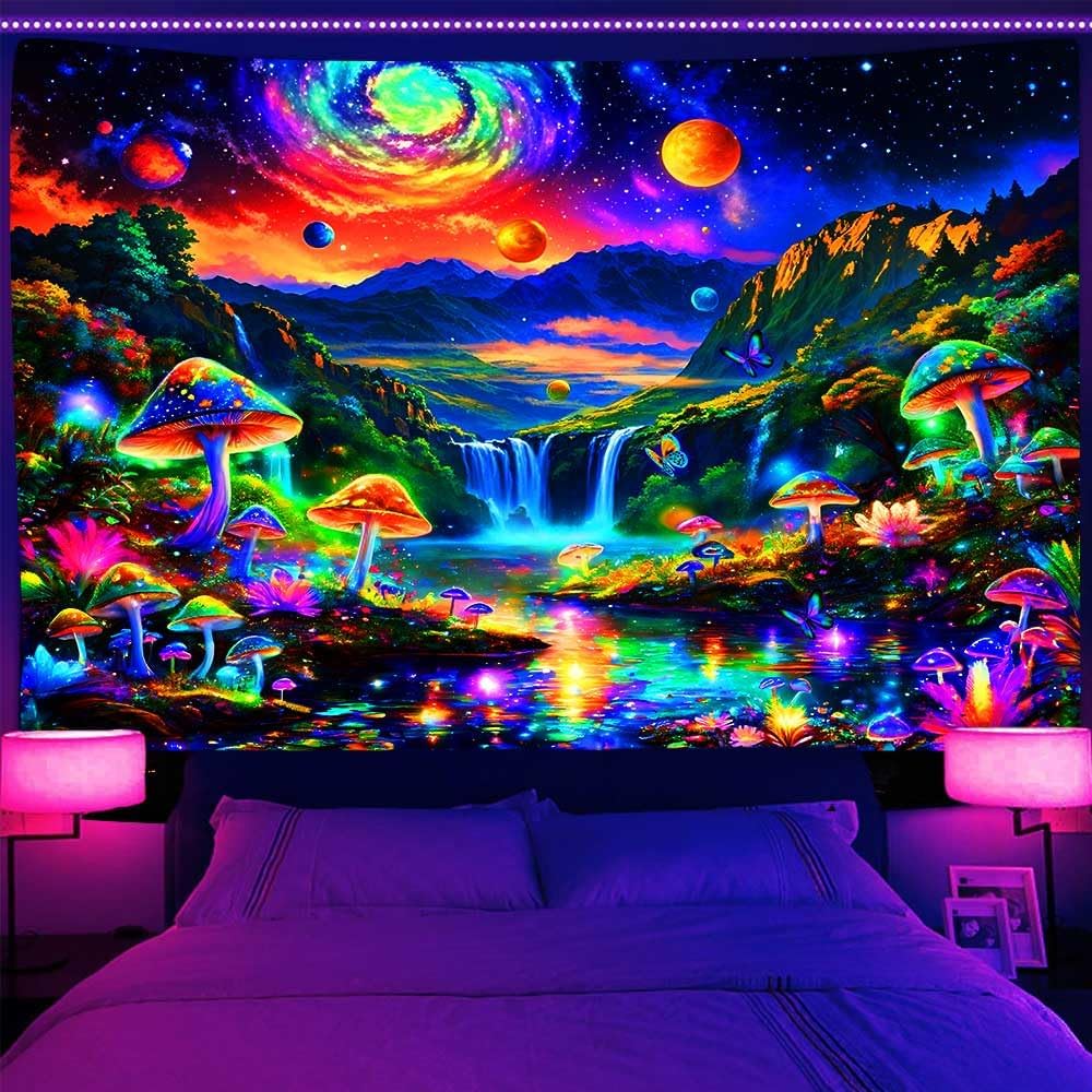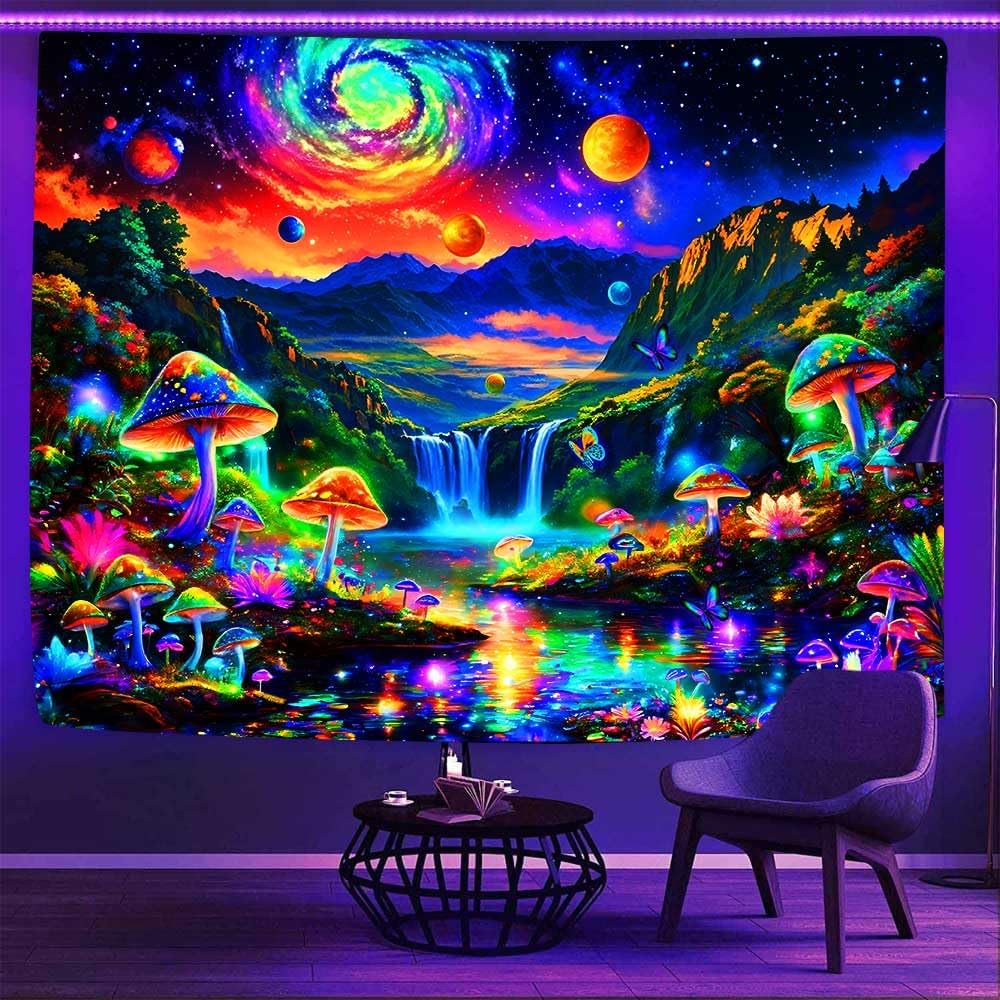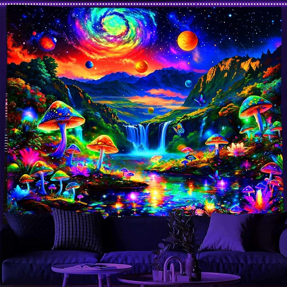 Ine Ive Blacklight Galaxy Space Tapestry UV Reactive Tapestry Mountain Waterfall Mushroom Nature Nature Poster Wall Hanging 80x60Inch for Bedroom Dorm Home Decor