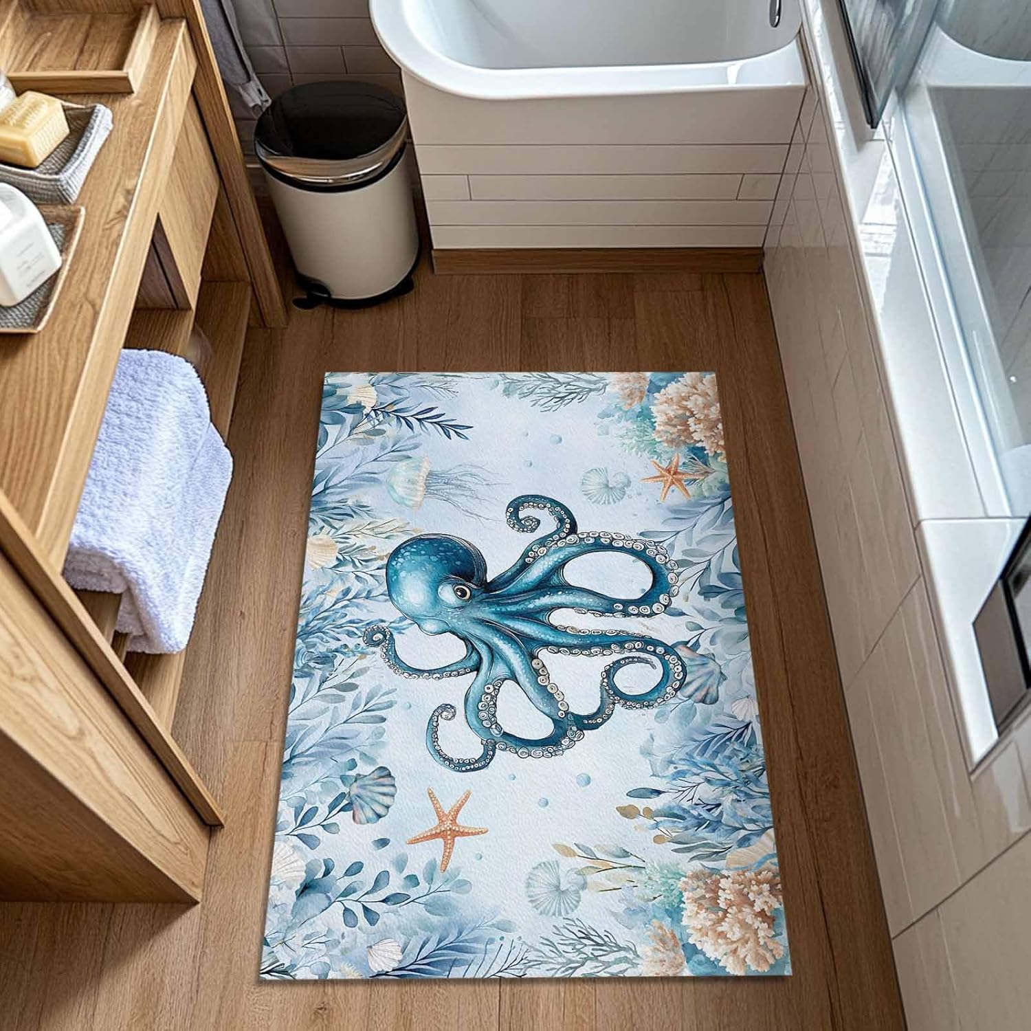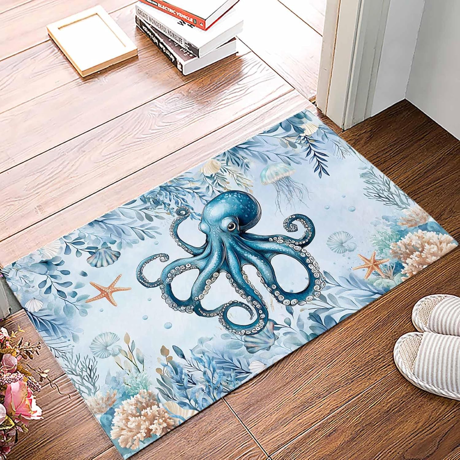 Ocean Octopus Entrance Floor Mat Personalized Doormat, Summer Jellyfish Turtle Welcome Door Mat, Low Profile Non Slip Entry Rugs for Kitchen Bathroom Home Front Decor, 18x30in