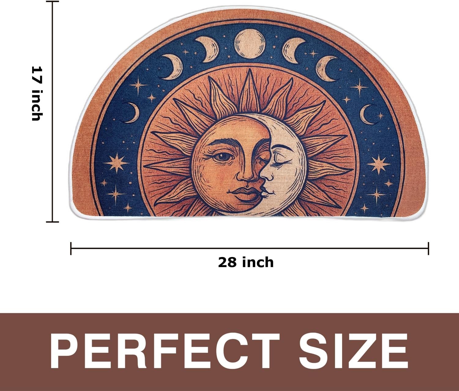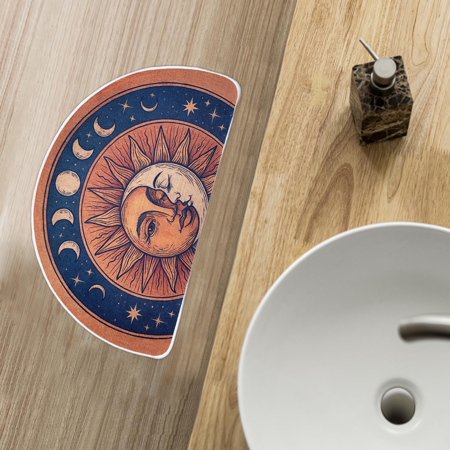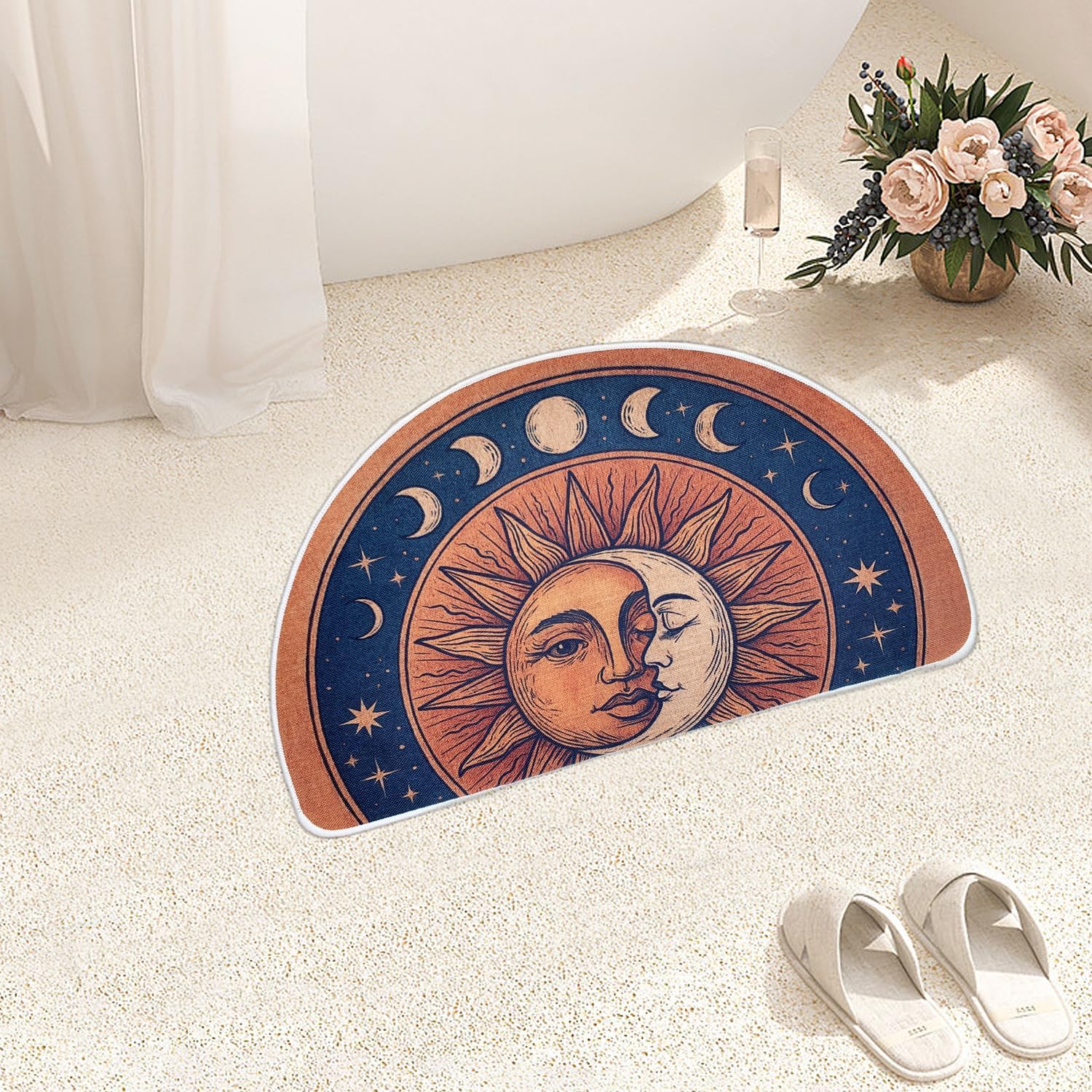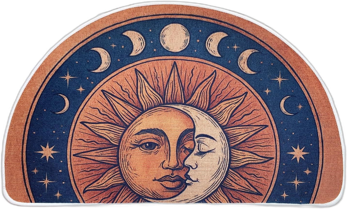 Semi Round Boho Sun and Moon Bathmat Fun Bath Mat Non Slip Washable Bathroom Decor Half Circle Bohemian Home Floor Doormat Semicircle Indoor Rug (Yellow, No Fluff)