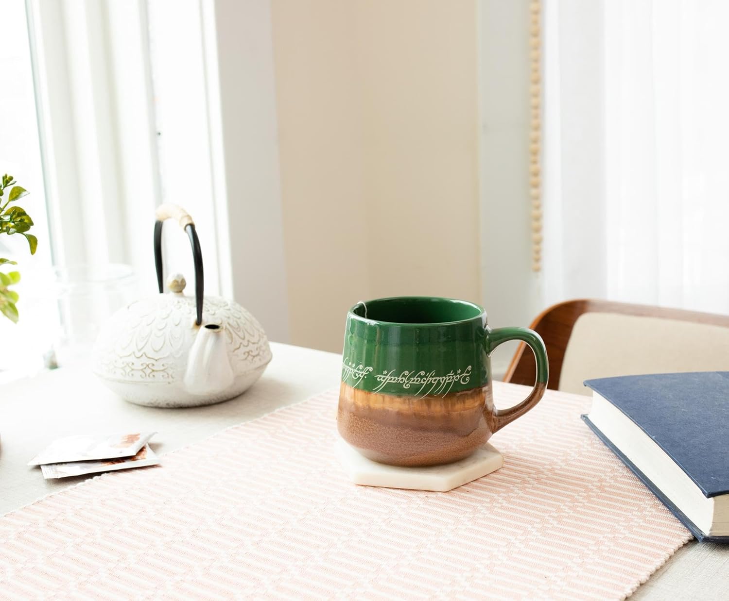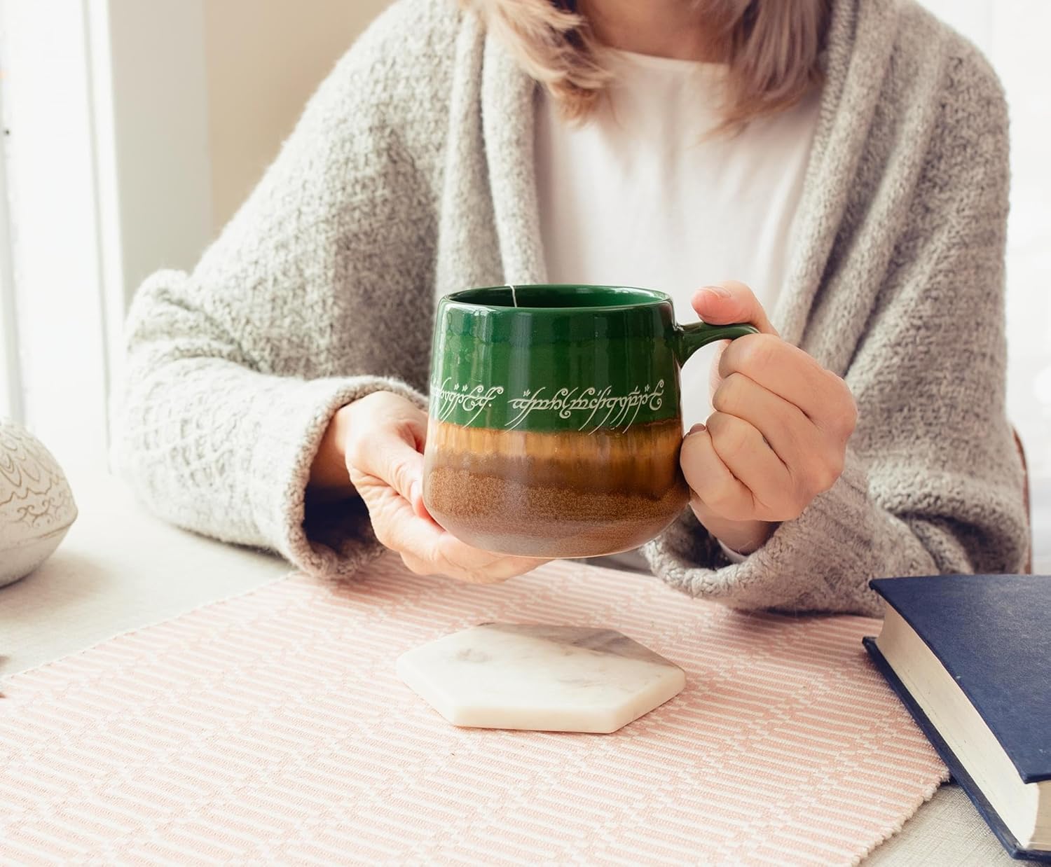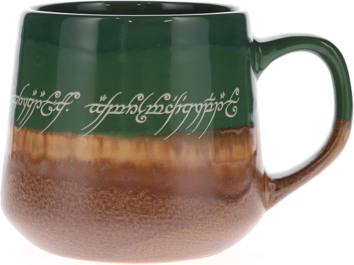 Embrace the elegance of Elven design with the Silver Buffalo Lord of the Rings Elven Text Tapered Pottery Mug. With a striking high-gloss reactive glaze and the iconic inscription in Elvish Tengwar script, this 18-ounce ceramic mug captures the mystique of Middle-earth in every sip. The durable tapered pottery style makes it a perfect choice for your morning coffee, relaxing tea time, or late-night fan marathons. Dishwasher and microwave safe, it’s as practical as it is magical—ideal for any Tolkien enthusiast. Whether you’re a hobbit, elf, dwarf, or wizard at heart, this mug is your daily reminder that even the smallest sip can change the course of your day. Silver Buffalo provides fans with their favorite official character merch. Working in collaboration with licensors and brands, Silver Buffalo develops unique, creative, and ground-breaking products devoted to detail and innovation. Silver Buffalo prides itself on manufacturing and distributing playful products that connect fans with their favorite cartoon characters, superheroes, movies, tv-series and more. CELEBRATE YOUR FANDOM!