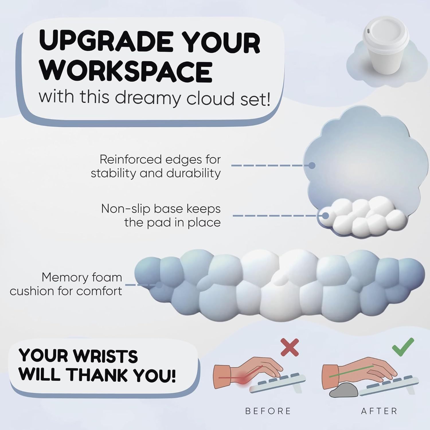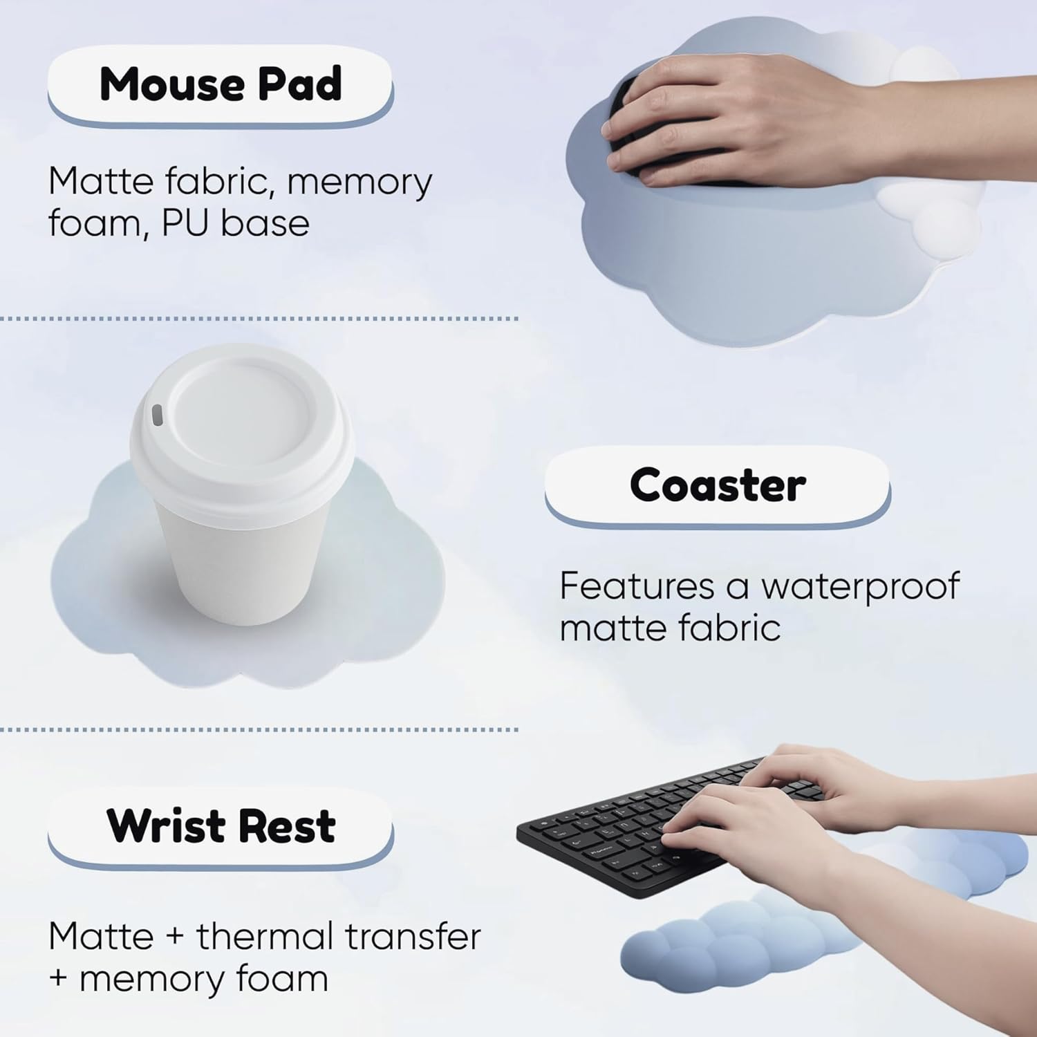 Float into Comfort – Cloud Wrist Rest Set for Keyboard, Mouse & Matching Coaster Turn your desk into a cozy, dreamy workspace with our Cloud Wrist Rest Set, designed for comfort, cuteness, and ergonomic support. This charming 3-piece bundle includes a keyboard arm rest, a cloud mouse pad with wrist rest, and a matching coaster—perfect for typing, working, or gaming in total comfort. The keyboard wrist support and desk arm rest pad are filled with soft, high-density memory foam that gently cushions your wrists and arms. Whether you need a hand rest for keyboard, an arm rest for keyboard, or a full wrist pad for keyboard and mouse, this set has you covered. It helps reduce fatigue, pressure, and discomfort during long hours at the desk. The adorable cloud design makes this the ultimate cloud keyboard wrist rest—equal parts fun and functional. Ideal as a cute mouse pad with wrist rest for students, gamers, or professionals looking to brighten up their desk. Whether you’re after a keyboard rest wrist pad or a desk wrist pad, this set delivers style and support in one. Non-slip rubber bases keep your wrist pads securely in place even during the busiest work sessions. Key Benefits: Soft memory foam wrist rest for keyboard and mouse for ergonomic comfort Unique cloud keyboard wrist rest design adds charm to your workspace Ideal for long hours of typing, gaming, or work Non-slip base and reinforced edges for stability and durability Includes a bonus coaster to complete your aesthetic setup Upgrade your workspace with this dreamy cloud set—your wrists will thank you!