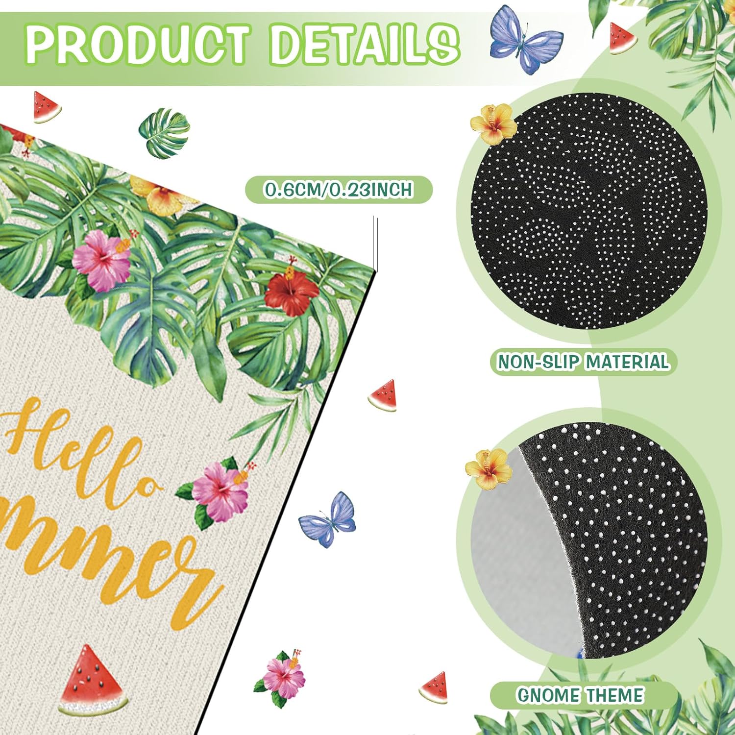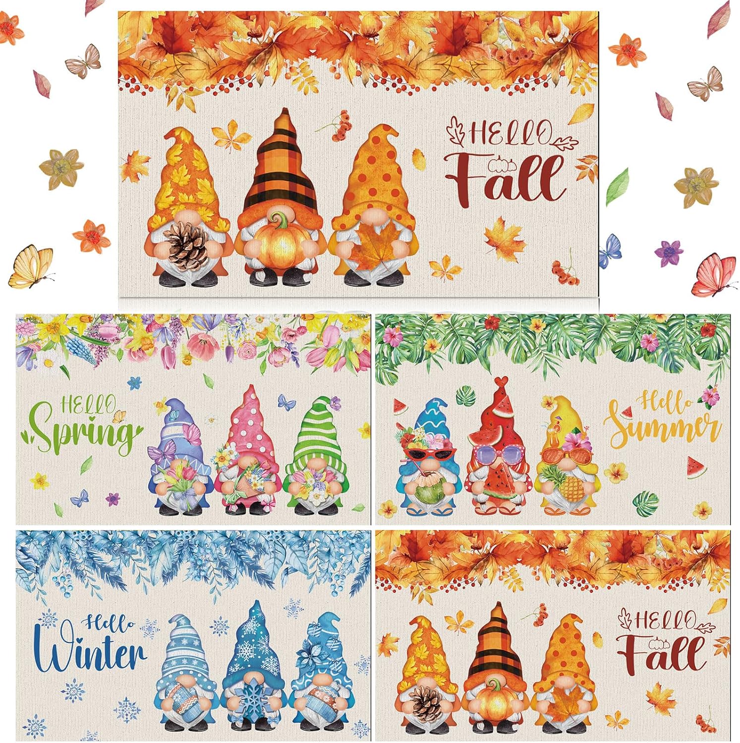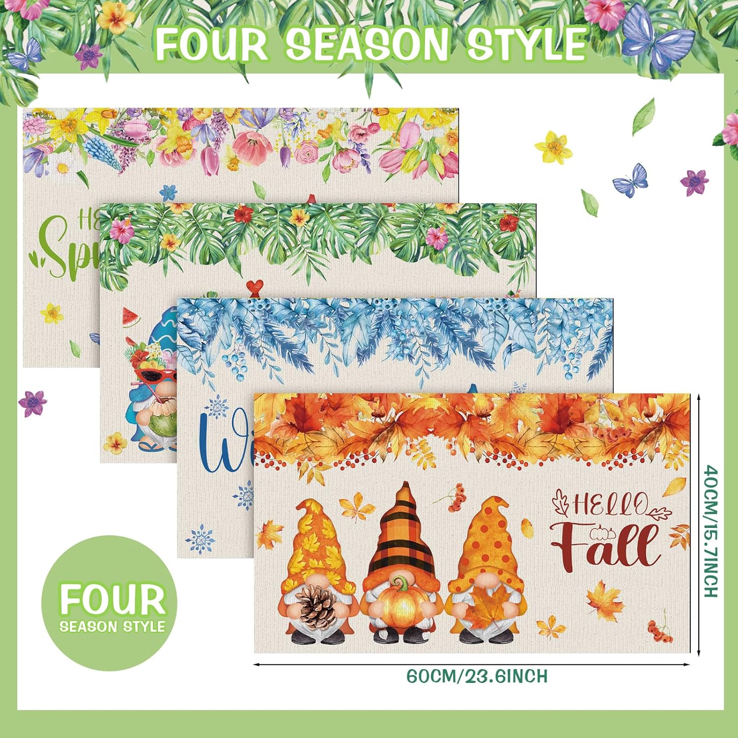 Features: Each package includes four distinct doormats, each representing a different season, spring, summer, autumn, and winter. This seasonal gnome doormat set ensures your home stays seasonally stylish all year round. With these seasonal gnome doormat offerings, you can effortlessly uphold a lively ambiance in your home, regardless of the season. Experience an instant seasonal upgrade right at your doorstep. Specifications: Material: non woven fabrics and polyester Color: multicolor Size: 23.62 x 15.75 inch/ 60 X 40 cm Package includes: 4 x Seasonal doormat Notes: Manual measurement, please allow slight errors on size. The color may exist a slight difference due to different screen displays.