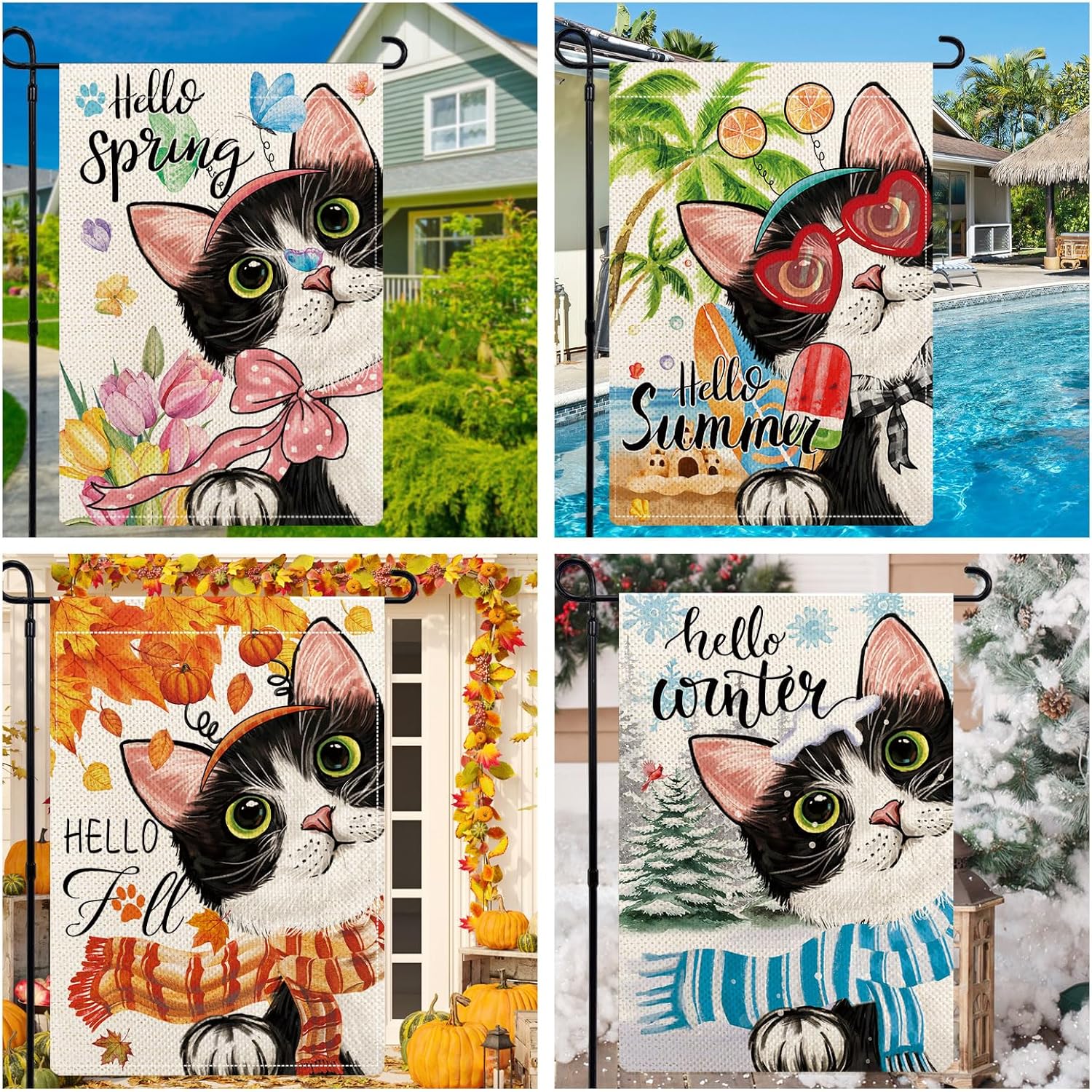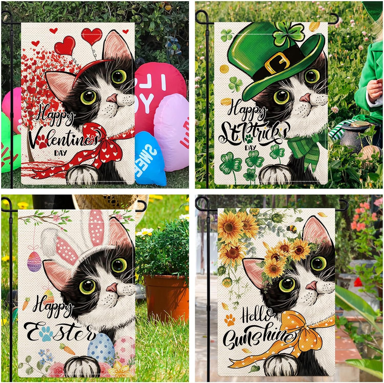 YOVOYOA Cute Black Cat Garden Flags for Outside Set of 12, Welcome Seasonal Garden Flags 12×18 Double Sided, Kitten Yard Flags for All Seasons and Holidays, Winter Spring Yard Flag for Holiday Decor